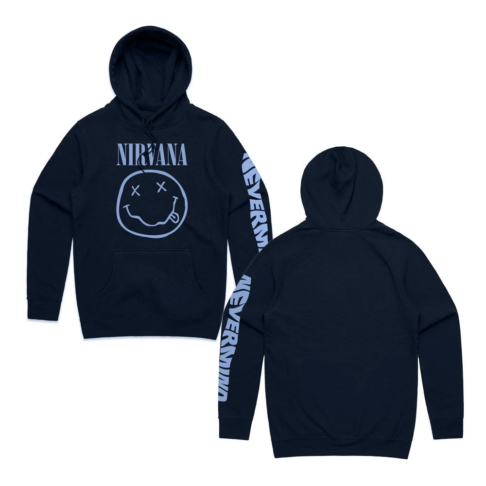 This Nirvana hoodie features the iconic smiley face and Nevermind on the sleeve.